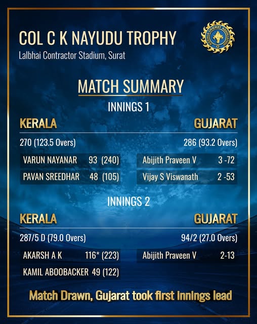 Kerala’s spirited effort, led by a strong second-innings declaration at 287/5, saw the CK Nayudu Trophy clash against Gujarat finish level.