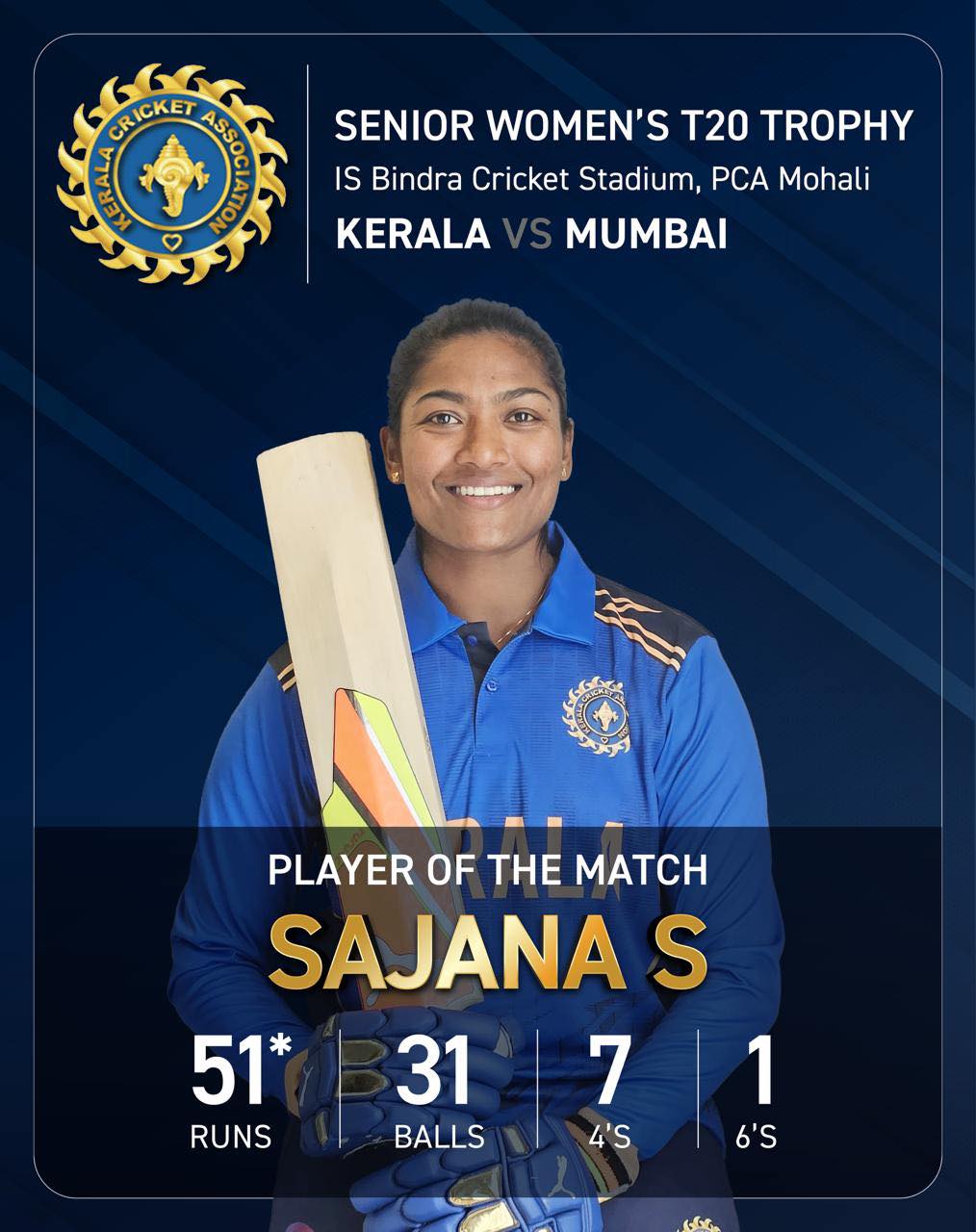 Kerala conquers Mumbai! In a nail-biting finish, our women powered past Mumbai’s 151-run target with one ball to spare. Skipper Sajana S led the charge with a superb half-century and was named Player of the Match!