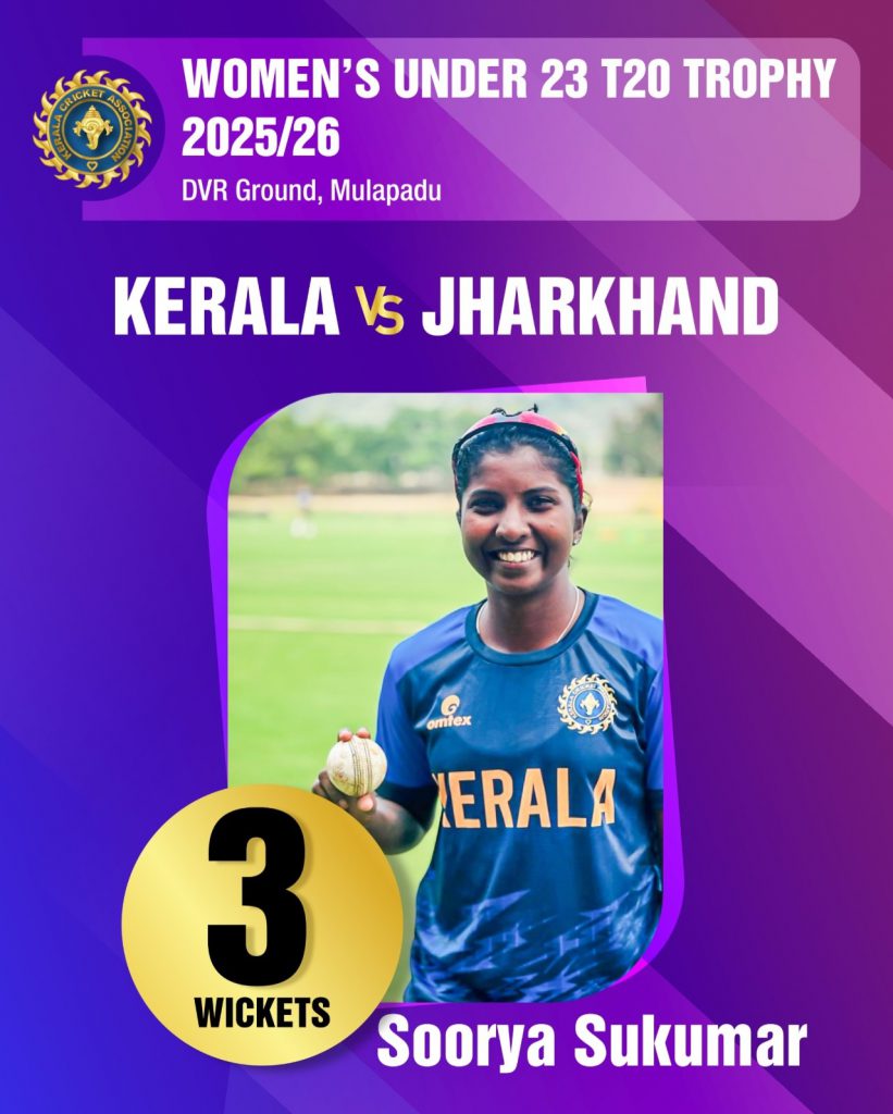 After restricting Jharkhand to 75/8 (20 overs), Kerala chased down 76/6 in 17.1 overs to seal a confident four-wicket win.