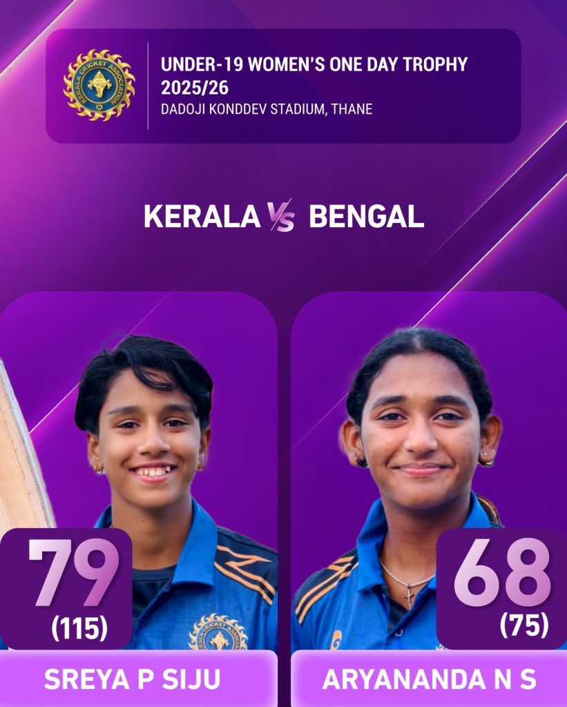 Bengal edge past Kerala by 23 runs in the Under-19 Women’s One Day Tournament. Chasing 266, Kerala were bowled out for 242 in 49.4 overs despite fighting knocks from Sreya P Siju (79 off 115) and Aryananda N S (68 off 75).