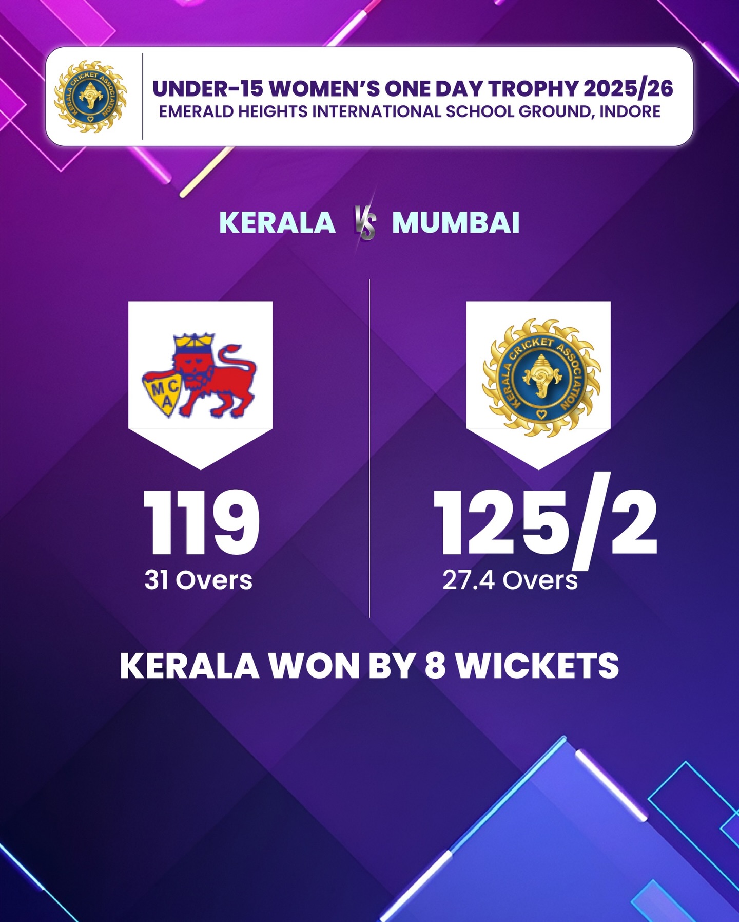 8 wicket win over Mumbai in the U15 Women’s One-Day Tournament!