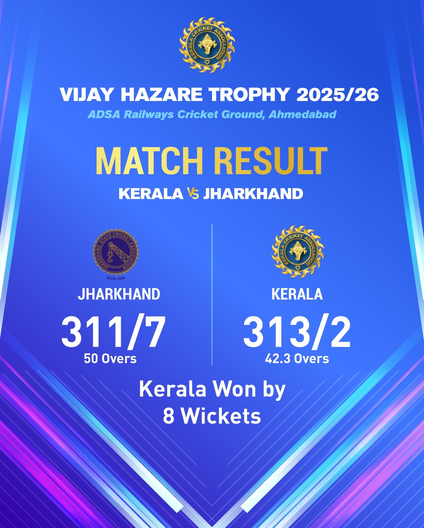 A dominant 8-wicket win over Jharkhand in the Vijay Hazare Trophy.