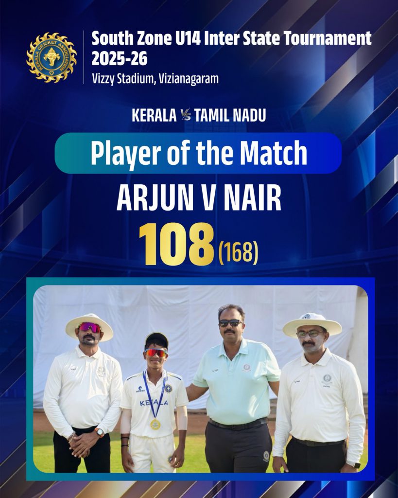 A magnificent century from Arjun V Nair, impactful spells from Dheeraj and Tharun MS, and crucial contributions throughout the match powered Kerala to a convincing 5-wicket victory at the South Zone U14 Inter State Tournament 2025–26.